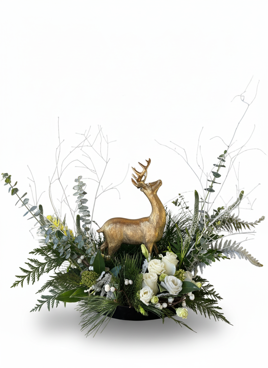 Peaceful white blooms and textured winter greens surround a keepsake reindeer figurine in this beautiful arrangement